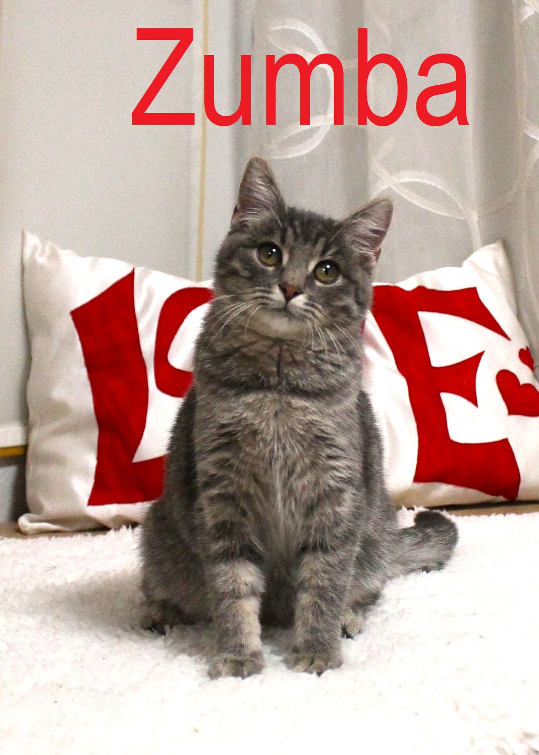 Šokis, pokis, šuolis, guolis, žaislas, maistas, zumba, jumba, kulverstukas – va jums ir dailus katukas 😉 . Ši maža, linksma padauža vardu Zumba ieško namų, kuriuose namiškiai džiaugsis jos linksmybėmis, žaidimais ir išdaigomis (Y) . Kaip jau supratote, su ja tikrai nebus nuobodu – katytė smalsi, žaisminga, linksma ir drąsi, jos visuomet pilni namai, tad pūkuota murkaliukė naujų šeimininkų prašys ne tik gardesnio maistelio, bet ir kasdienės dozės žaidimų bei paglostukų 😉 (Y)